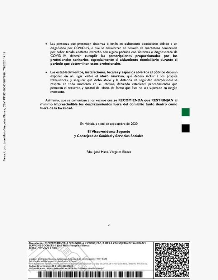 Tras el aumento de casos sospechosos y confirmados que se ha dado en los últimos días en Malpartida de Cáceres por Covid-19, y con el objetivo de prevenir y de reducir la velocidad de transmisión y el impacto del virus en el municipio, la Junta de Extremadura ha enviado a al Ayuntamiento de la localidad un documento en el que se recogen las medidas establecidas en la resolución del 4 de septiembre de 2020 para recordar a los vecinos el deber de cumplir con las mismas.