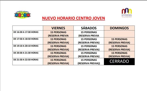 Debido a la instauración del nuevo Estado de Alarma y a la consiguiente limitación de la movilidad ciudadana en horario nocturno, el Ayuntamiento de Malpartida de Cáceres ha cambiado el horario de cierre del Centro Joven Municipal para que los usuarios puedan regresas a casa dentro del horario establecido.