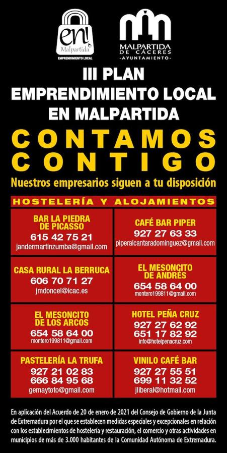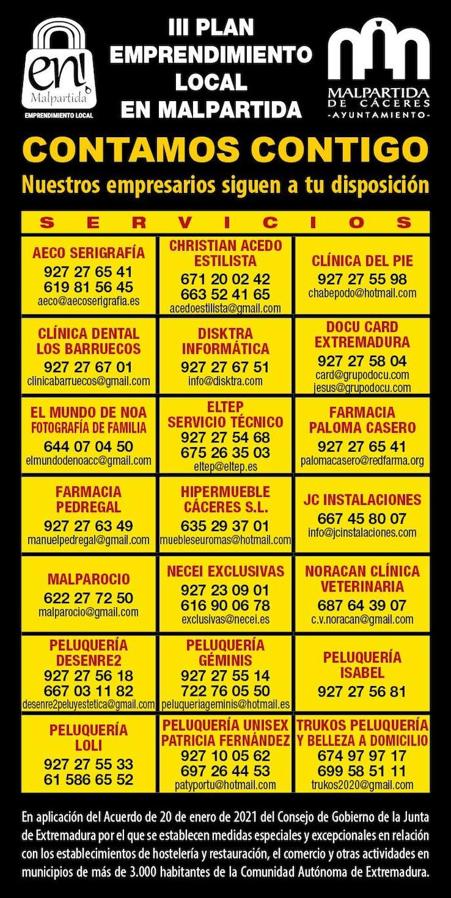 Debido a las últimas restricciones aprobadas por la Junta de Extremadura para la región extremeña, muchos negocios han tenido que cerrar sus puertas. Por ello, desde el ayuntamiento de Malpartida de Cáceres, con el objetivo de continuar con el apoyo a los negocios de la localidad, han compartido los contactos de los establecimientos y servicios que pueden continuar ejerciendo su actividad. Aunque muchos de ellos no pueden trabajar de forma presencial, sí pueden realizar encargos a domicilio o implementar un servicio de recogida, tal y como queda establecido en el acuerdo del 20 de enero de 2021 del Consejo de Gobierno de la Junta de Extremadura.