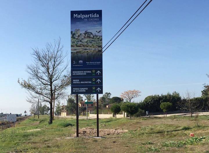 Se trata de unos carteles muy grandes donde se promociona principalmente los tres grandes recursos turísticos que tiene Malpartida que son el Monumento Natural de Los Barruecos, el Museo Vostell y Pueblo Europeo de las Cigüeñas.