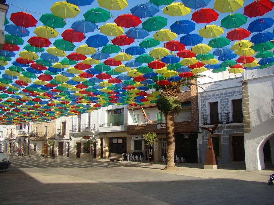 Más de 1.000 paraguas de colores decoran la Plaza Mayor de la localidad. Los famosos paraguas de colores de Malpartida de Cáceres ya han sido íntegramente colocados con el objetivo de dotar de sombra al centro del municipio, más concretamente la Plaza Mayor que se constituye como el espacio comercial abierto más grande de la localidad, pues en él se encuentran un total de 18 establecimientos comerciales más el propio Ayuntamiento.