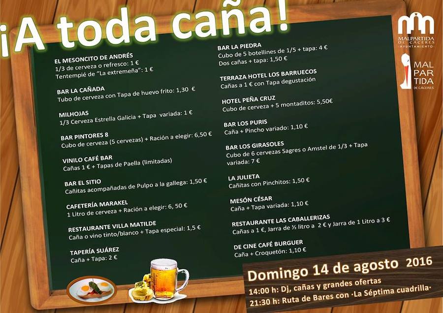 El domingo 14 de agosto, desde las 14.00 horas, la localidad celebra la ruta de tapas A toda caña. 18 son los establecimientos repartidos por todo el municipio que participan en esta ruta ofreciendo ofertas especiales de caña y pincho.