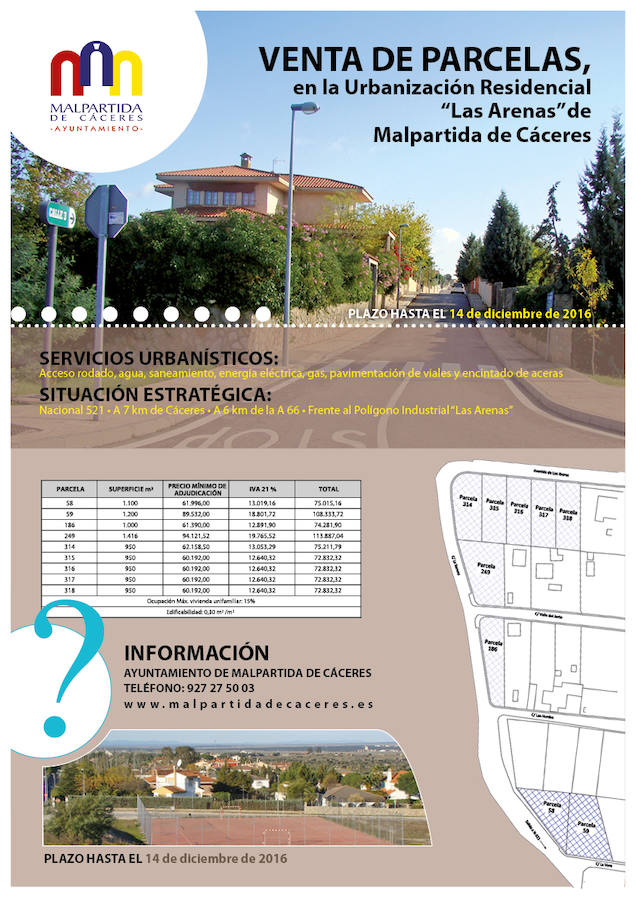 El ayuntamiento ha sacado a licitación la venta de varias parcelas en la Urbanización Residencial Las Arenas de Malpartida de Cáceres, cuyo plazo estará disponible hasta el 14 de diciembre.