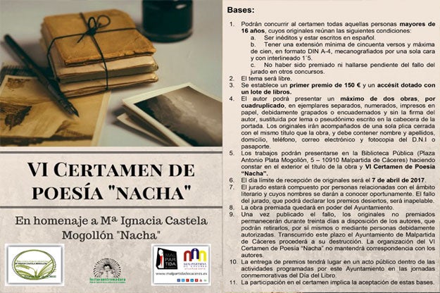 La Biblioteca Pública del Ayuntamiento de Malpartida de Cáceres convoca el VI Certamen de Poesía Nacha, en homenaje a la entrañable y experta bibliotecaria malpartideña Mª Ignacia Castela Mogollón, conocida por todos los malpartideños como Nacha.