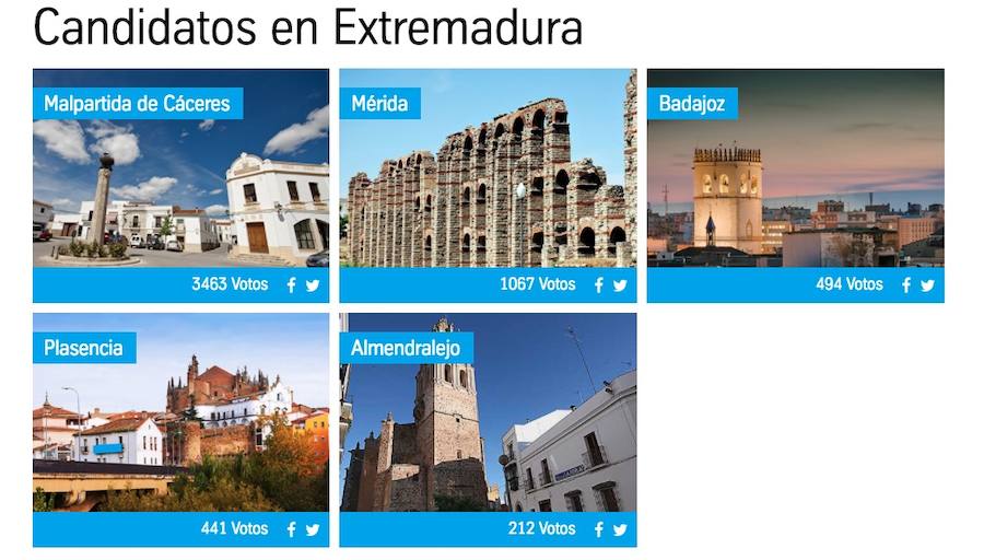 Además, cabe destacar, que Malpartida de Cáceres es la ganadora autonómica con mayor número de votos de todas las clasificadas hasta el momento, que son Carmona por Andalucía, Cartagena por Murcia y Ferrol por Galicia. Actualmente están en votación las CCAA de Valencia, Navarra, Aragón, Asturias y La Rioja.