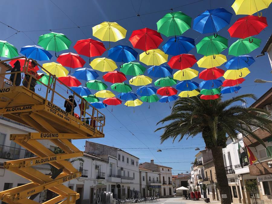 El Ayuntamiento de Malpartida de Cáceres ya ha comenzado a instalar los más de 1.000 paraguas que decorarán la Plaza Mayor de la localidad desde mayo hasta septiembre.