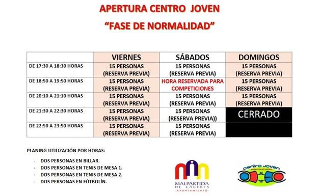 Hoy viernes, 23 de octubre, reabre el Centro Joven de Malpartida de Cáceres. Entre las nuevas medidas de seguridad que se van a poner en marcha para continuar con la prevención de la Covid-19, será necesario solicitar cita previa para asistir al mismo. Como ha comentado Alfredo Aguilera, alcalde de Malpartida de Cáceres, en el último comunicado emitido a trvés de las redes sociales, si algún joven va y hay sitio libre, podrá entrar, sino tendrá que esperar ya que deben «garantizar la salud por encima de todo».