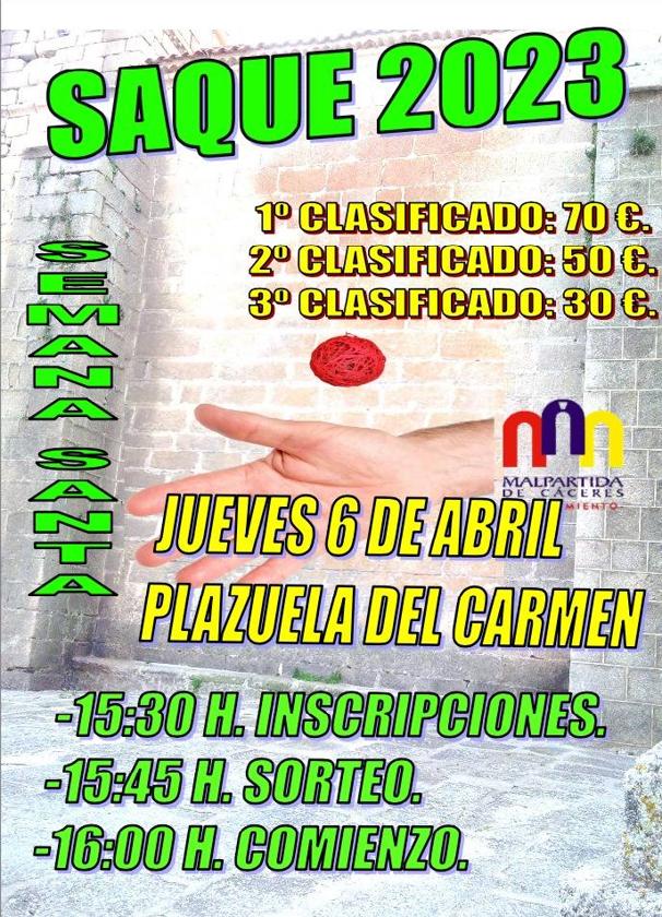El próximo jueves, día 6 de abril, dentro del programa de actividades de Semana Santa, Malpartida de Cáceres disfrutará un año más de su Torneo de Saque, un tradicional juego de la localidad parecido al frontón.